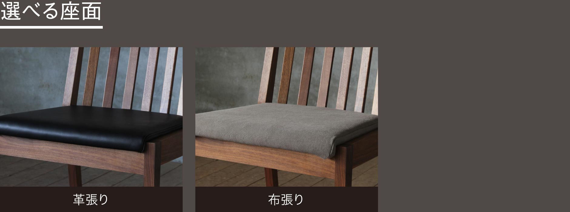座面は革張り、布張りの2種類。耐久性と高級感があり、オイルをたっぷりと染み込ませしなやかに作り上げた革張り。風合い豊かで、使い込むほどに味わい深くなっていく自然素材の布張りから、お客様に合った座りやすい座面を選ぶことが出来ます。