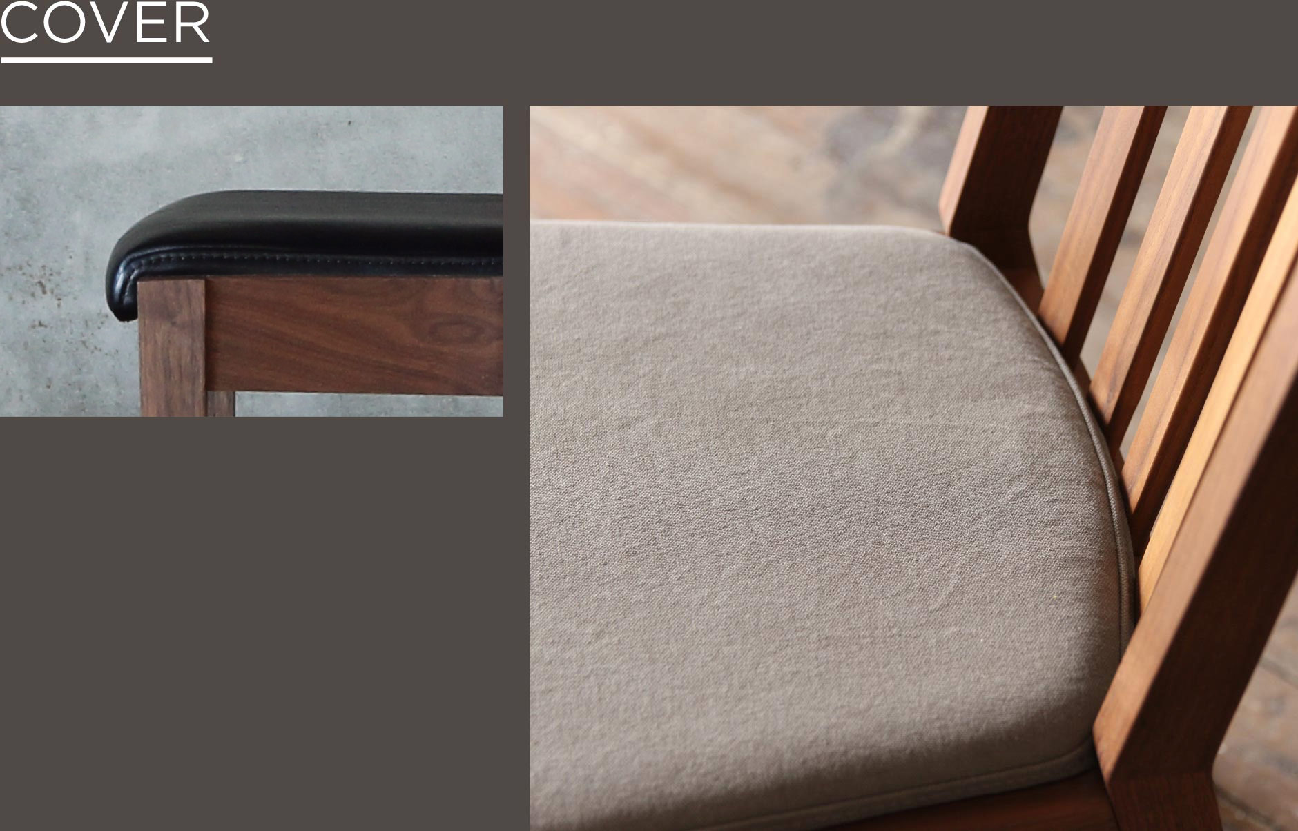 座面は革張り、布張りの2種類。耐久性と高級感があり、オイルをたっぷりと染み込ませしなやかに作り上げた革張り。風合い豊かで、使い込むほどに味わい深くなっていく自然素材の布張りから、お客様に合った座りやすい座面を選ぶことが出来ます。