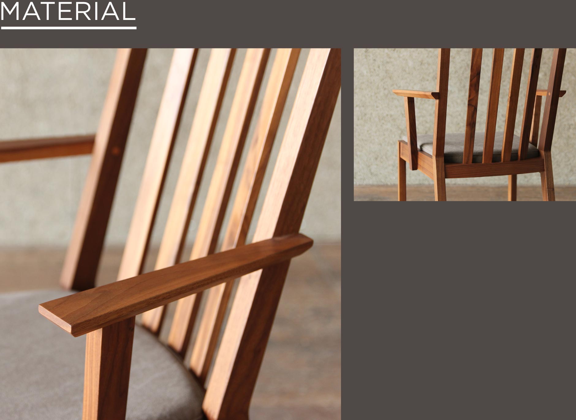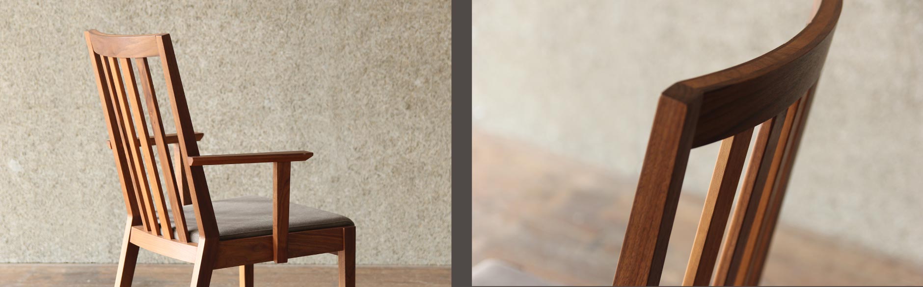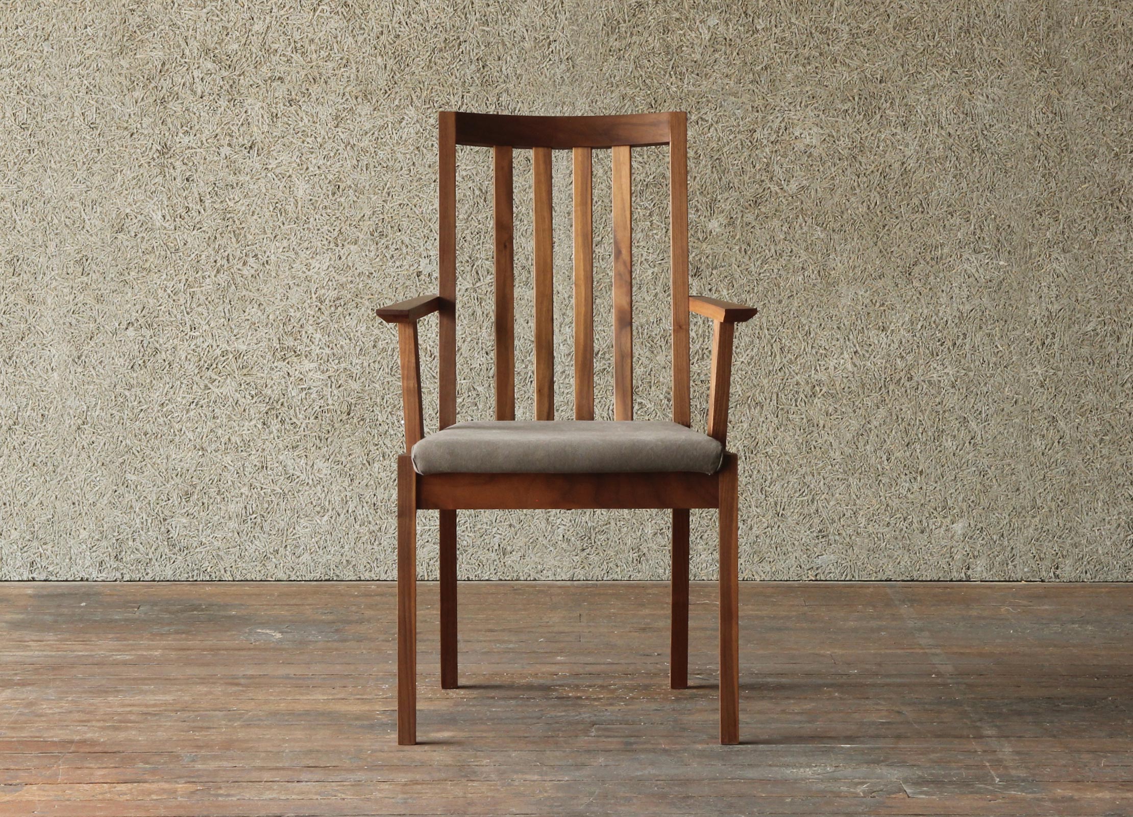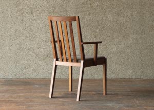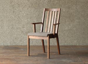 凛とした空気感を漂わせるダイニングチェア。ウォールナット等の無垢材を最大限活かした洗練されたシンプルなデザイン。ハイバックで背中を包み込むような掛け心地は、至福のひと時をもたらします。ショートアームでゆったり寛げ、スッキリしたフォルムを実現しています。
