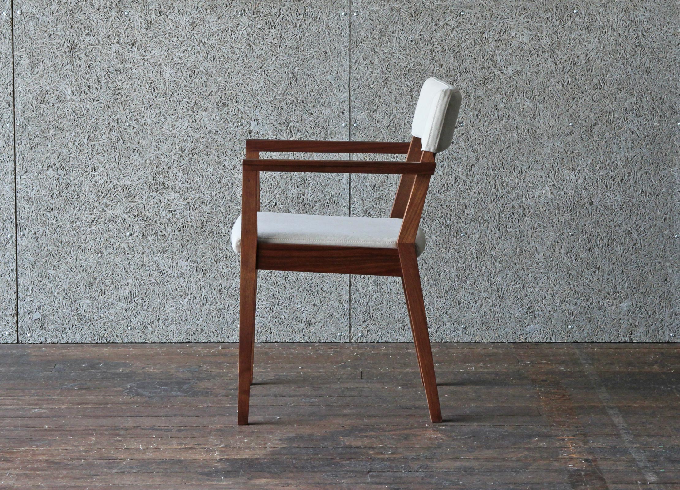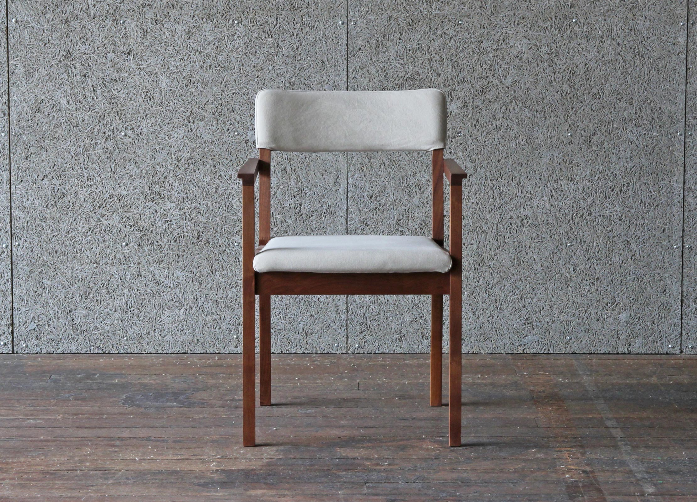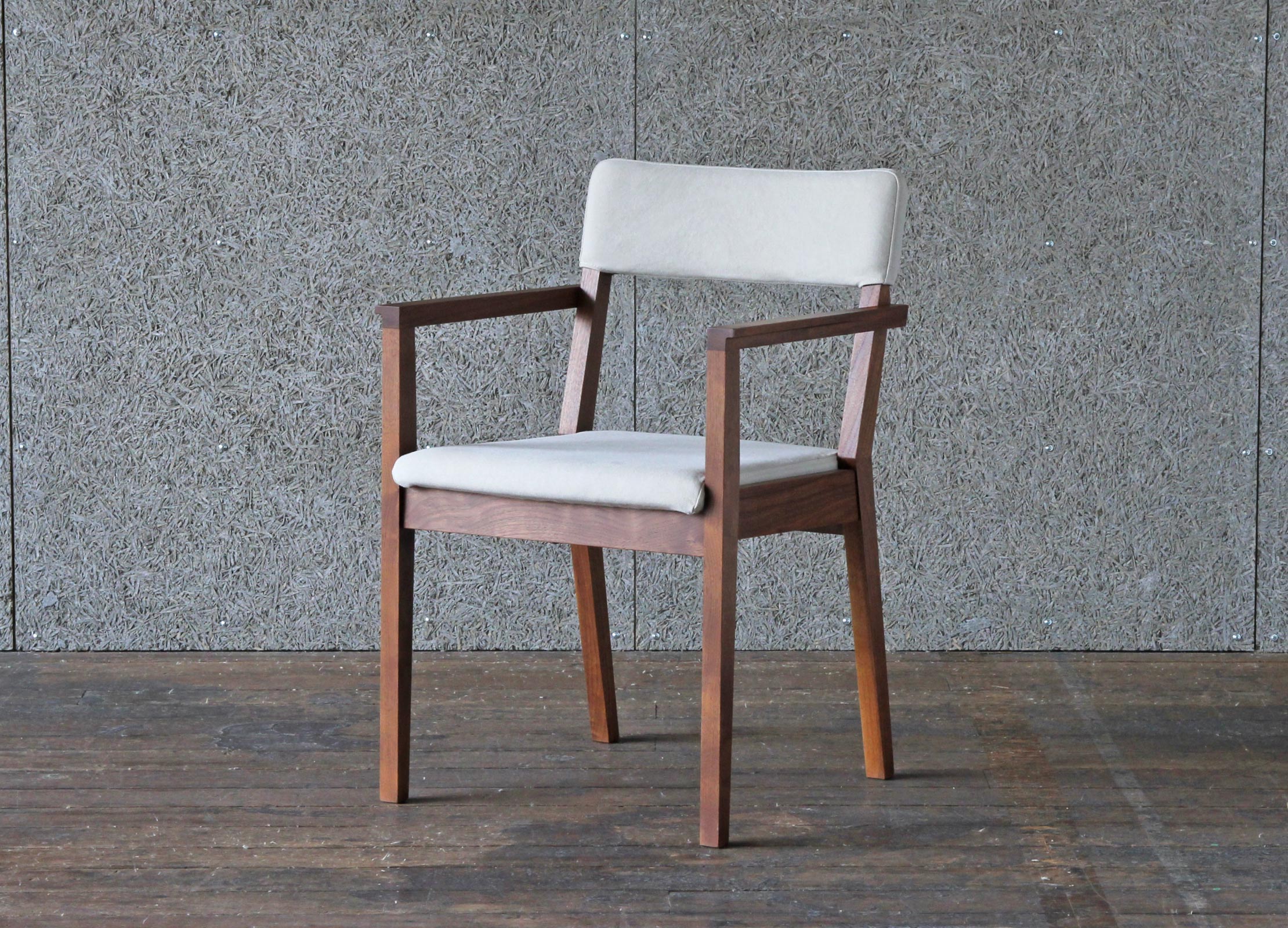 シンプルなデザインにクッション付きの背もたれで掛け心地にもこだわったアームチェア。直線的で長いアームが肘をしっかりと支えるので、ゆっくりとくつろいでいただくことができます。