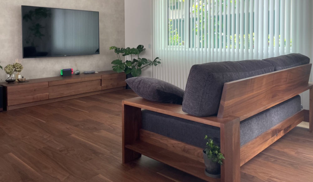 後ろ姿にもこだわってお選び頂いたソファ『SLC03』は無垢材をふんだんに使用したSOLIDでも絶大な人気を誇るソファ。建具や床に合わせてすべてウオールナットでまとめ、国産家具ならではの落ち着いた高級感のある空間になりました。(S様邸)