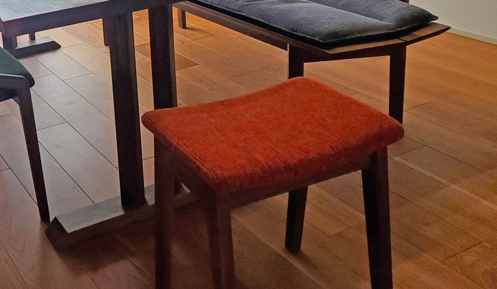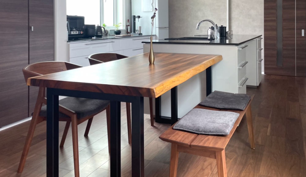 直線的ですっきりとしたダイニングセット。天然耳を使用したこれぞ無垢家具と呼ぶに相応しいテーブル、無垢材を用いた背付きのベンチ、曲線が美しいチェアが組み合わさった上品な空間に。さらに天板に節を残すことで、ウォールナットの風合いが最大限に活かされます。(T様邸)