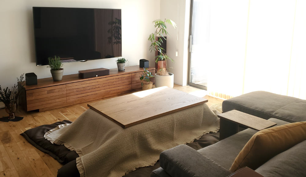 オーク系の床を基調としたナチュラルな空間にSOLIDの家具をウォールナットでご注文いただきました。ローソファSLC02は幅の大きなサイズでも、お部屋を広々見せます。玄関先のラグや照明・雑貨などトータルで拘ったインテリア空間。(Y様邸)