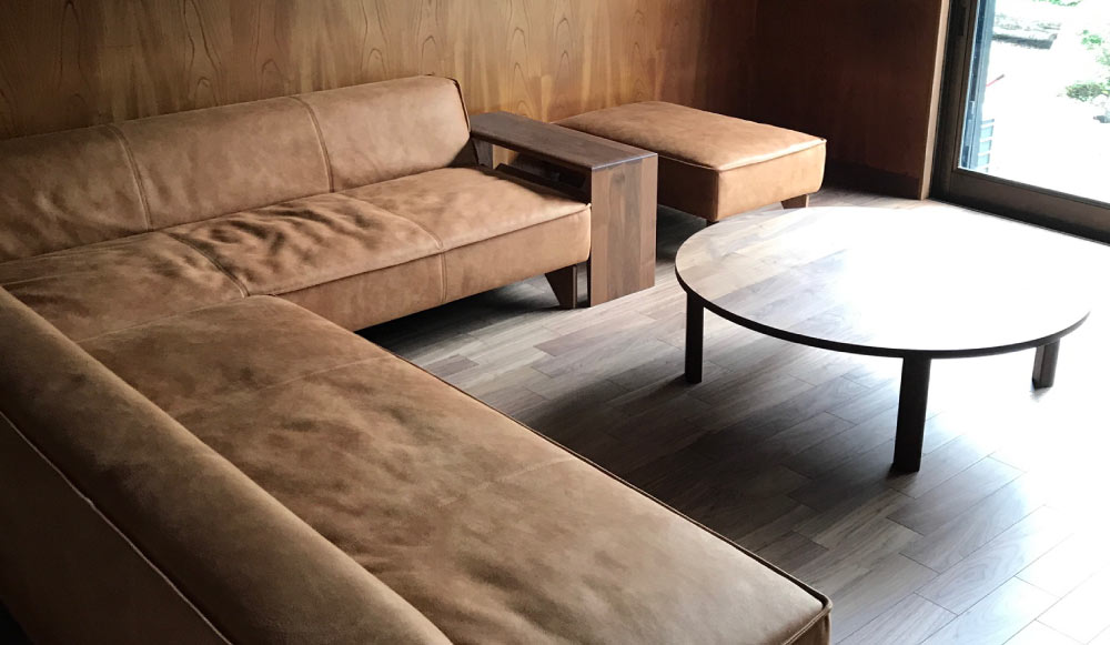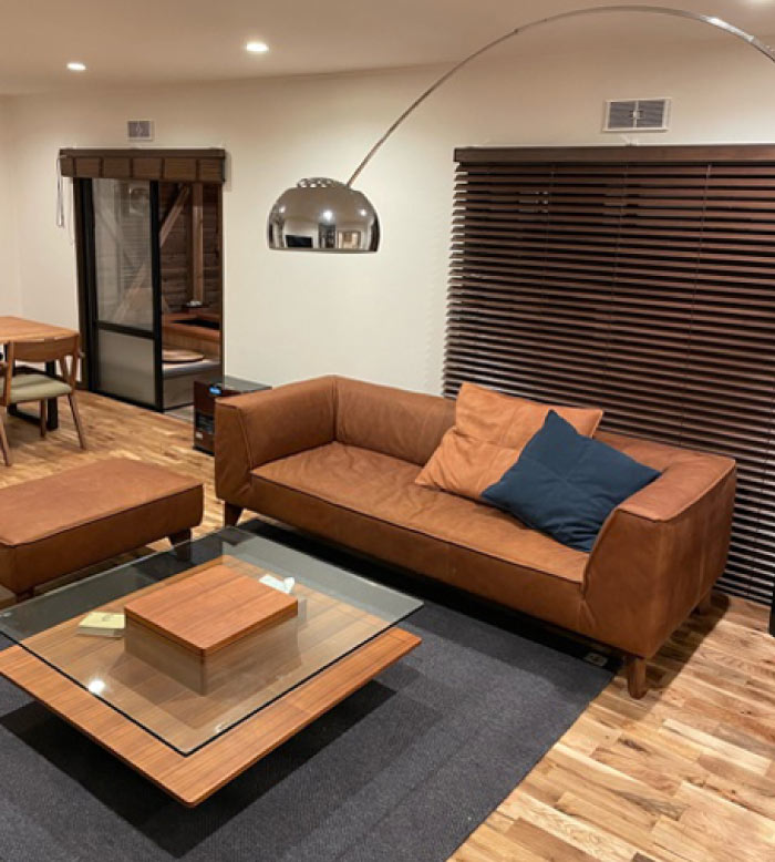 SOLID屈指のボリューム感を誇る大人気ソファ『SLC05』。空間にはソファ、テーブル、照明と必要最低限の家具のみでコーディネートされた理想的な和モダンスタイル。床や壁、家具やソファの張地も含め同系色で揃えた落ち着きのある空間に。(N様邸)
