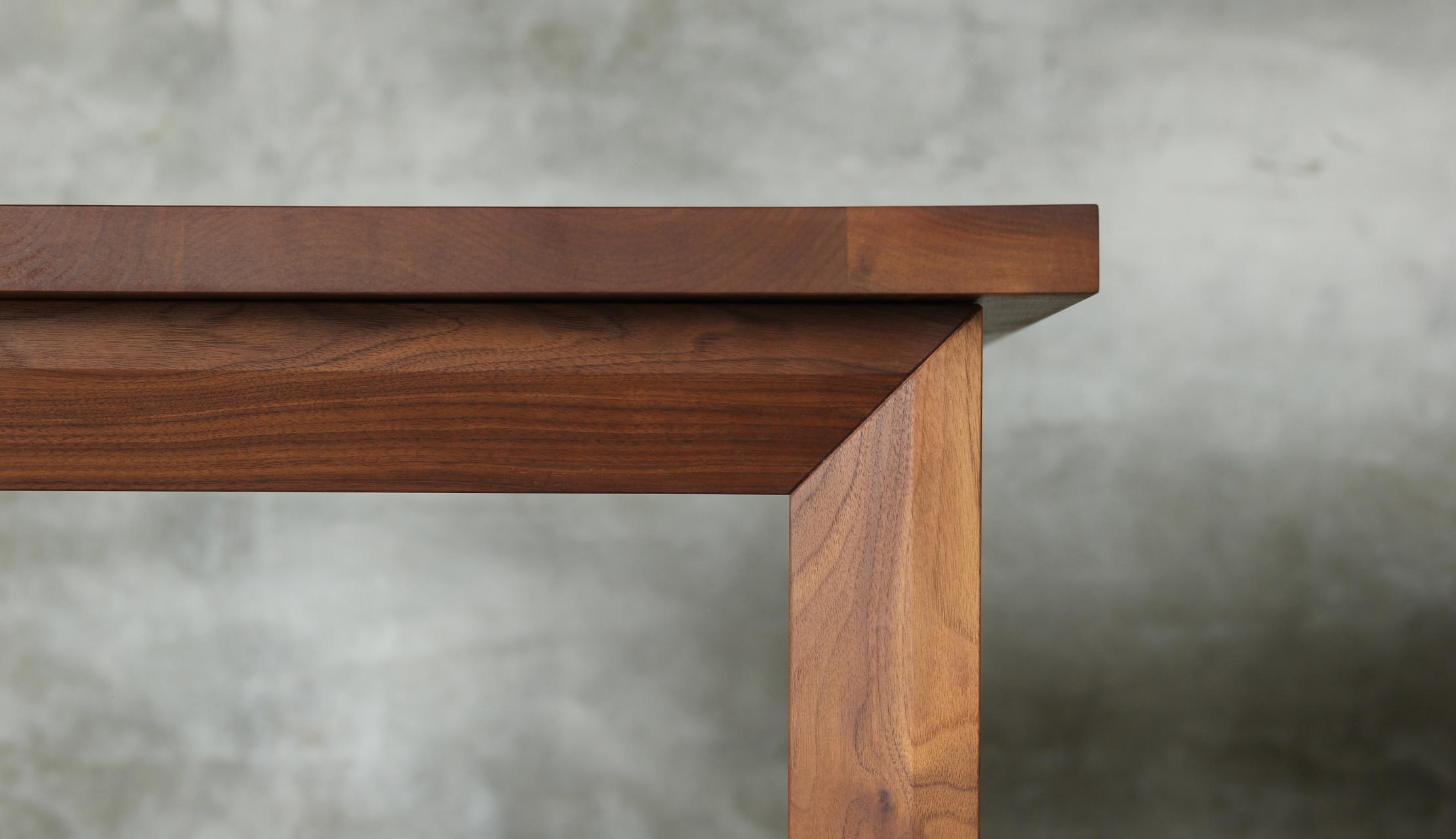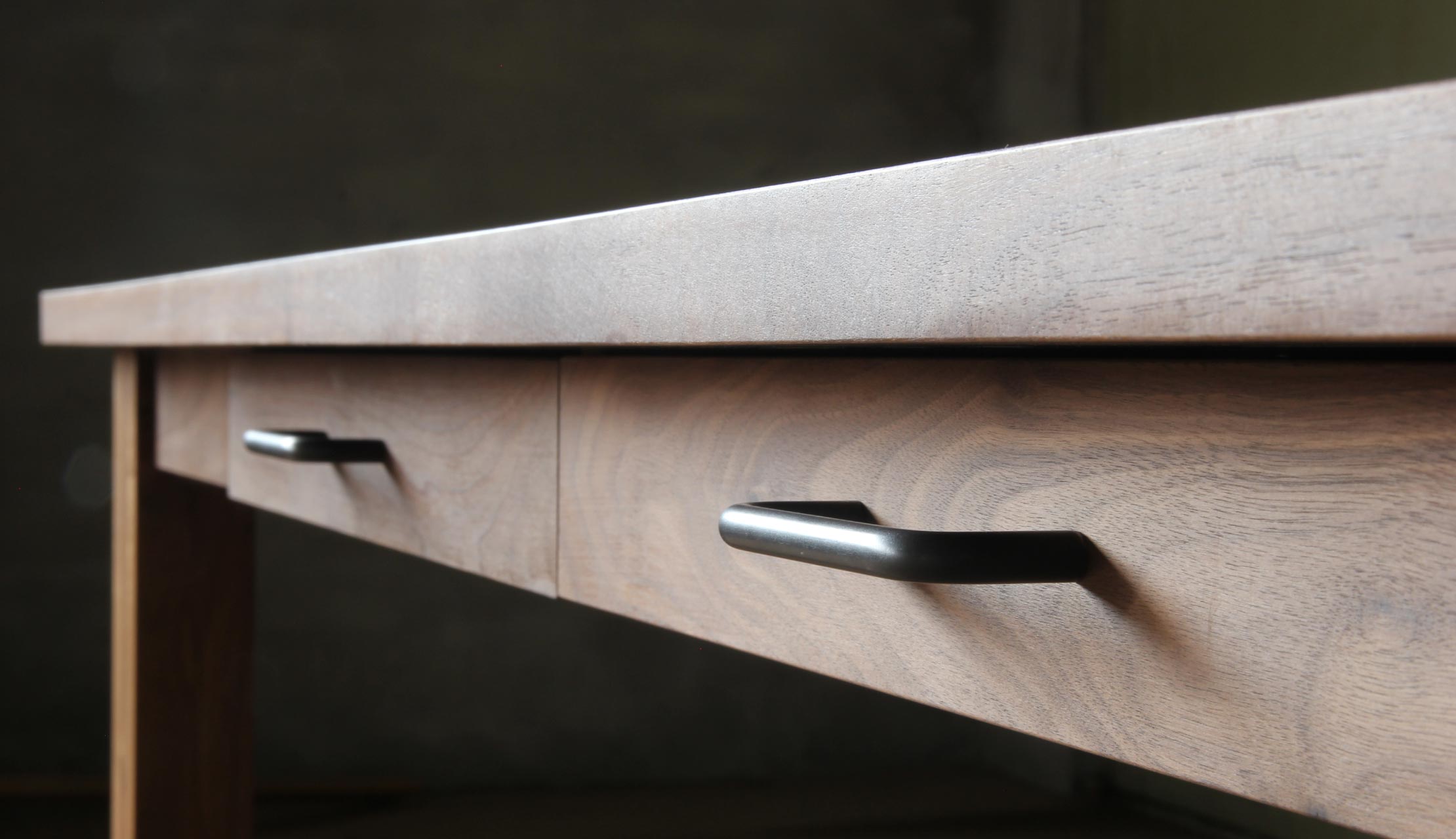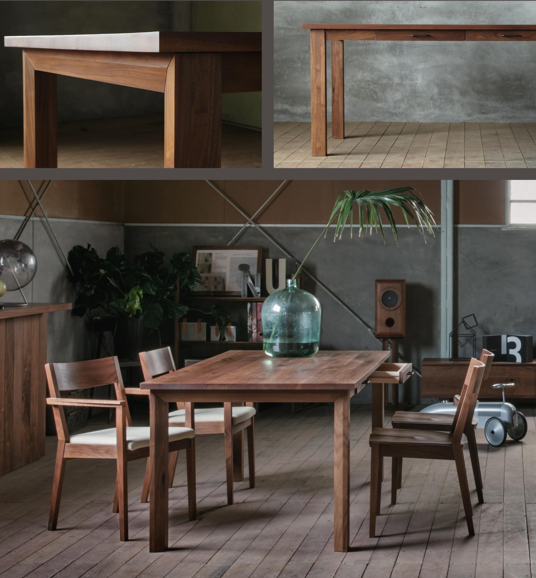 脚から天板にかけてほどこされたエッジのきいたデザインカット。陰影が生まれることで、どの角度から見てもテーブルの存在感が引き立つようにこだわりました。引出には真鍮やクロカワ鉄といった異素材を使用し、経年変化を楽しみつつ、天然木との組み合わせにも遊び心をくすぐられるデザインになっています。
