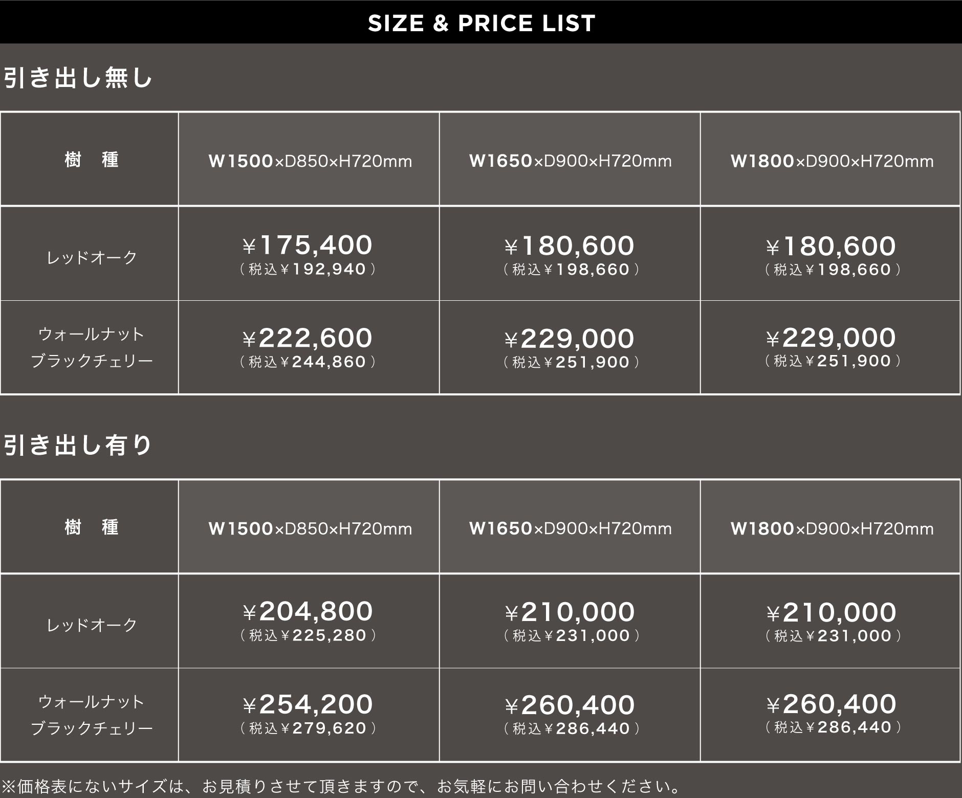 ※節有りはウォールナットとブラックチェリーのみ。
