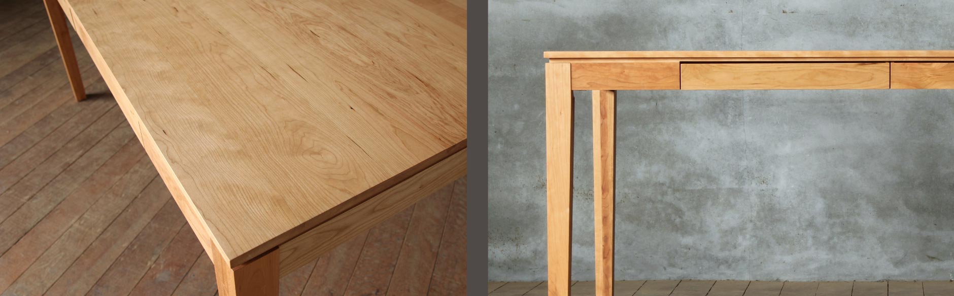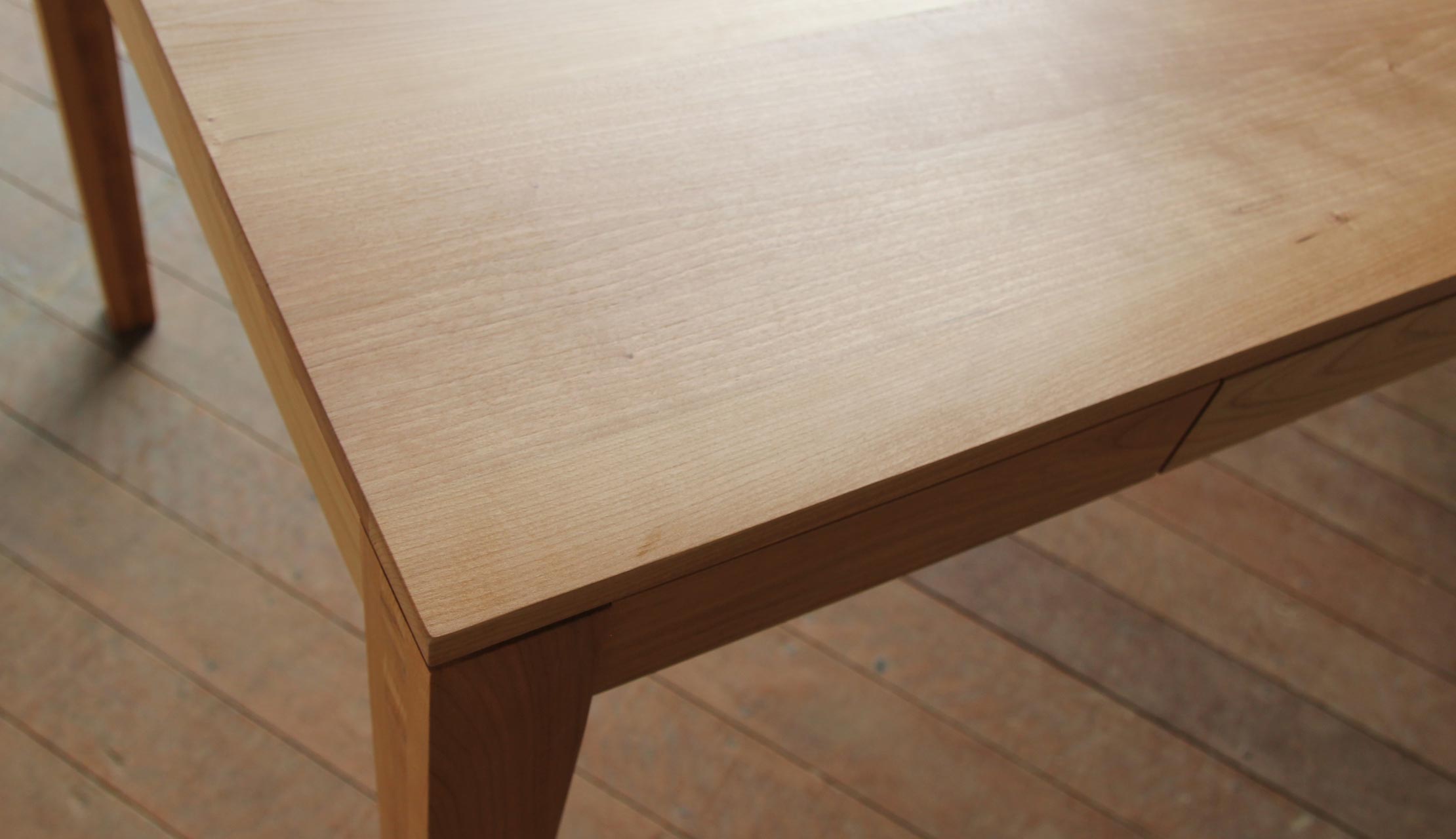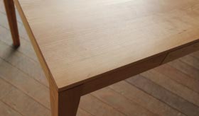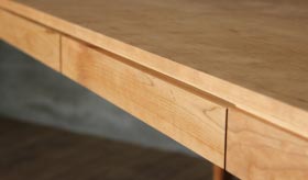時代に流され無いシンプルなデザインだからこそディテールの美しさに拘りぬきました。天板と脚をつなぐ幕板の位置にできた空間や細身のテーパー脚がスタイリッシュな印象を与えます。