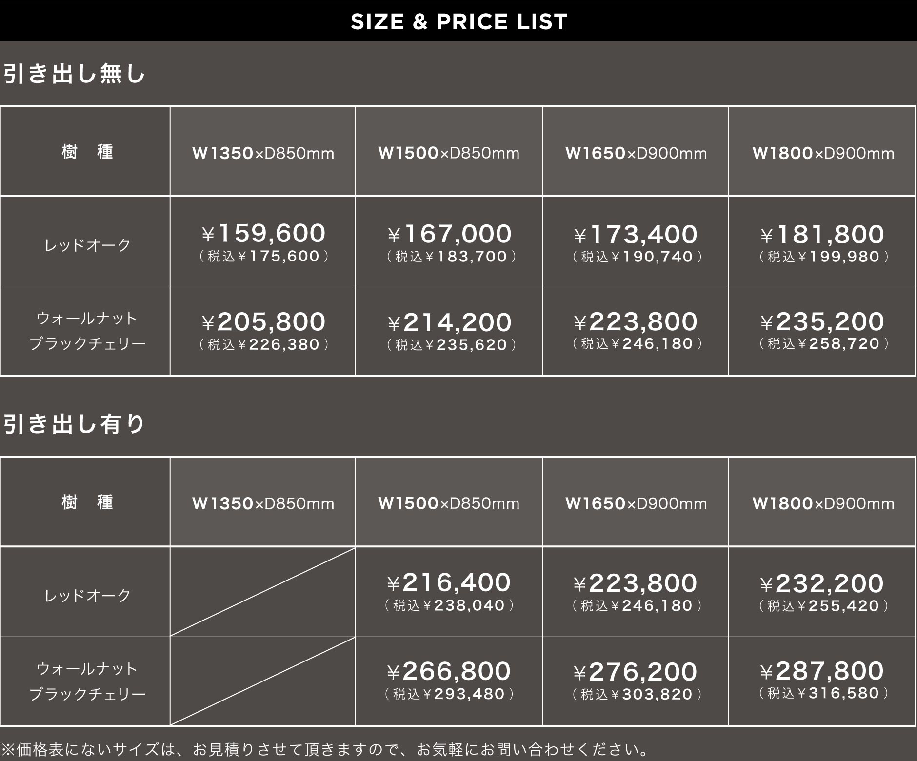 [引出しタイプ]W1500/1650/1800×D850~900×H620~750mm