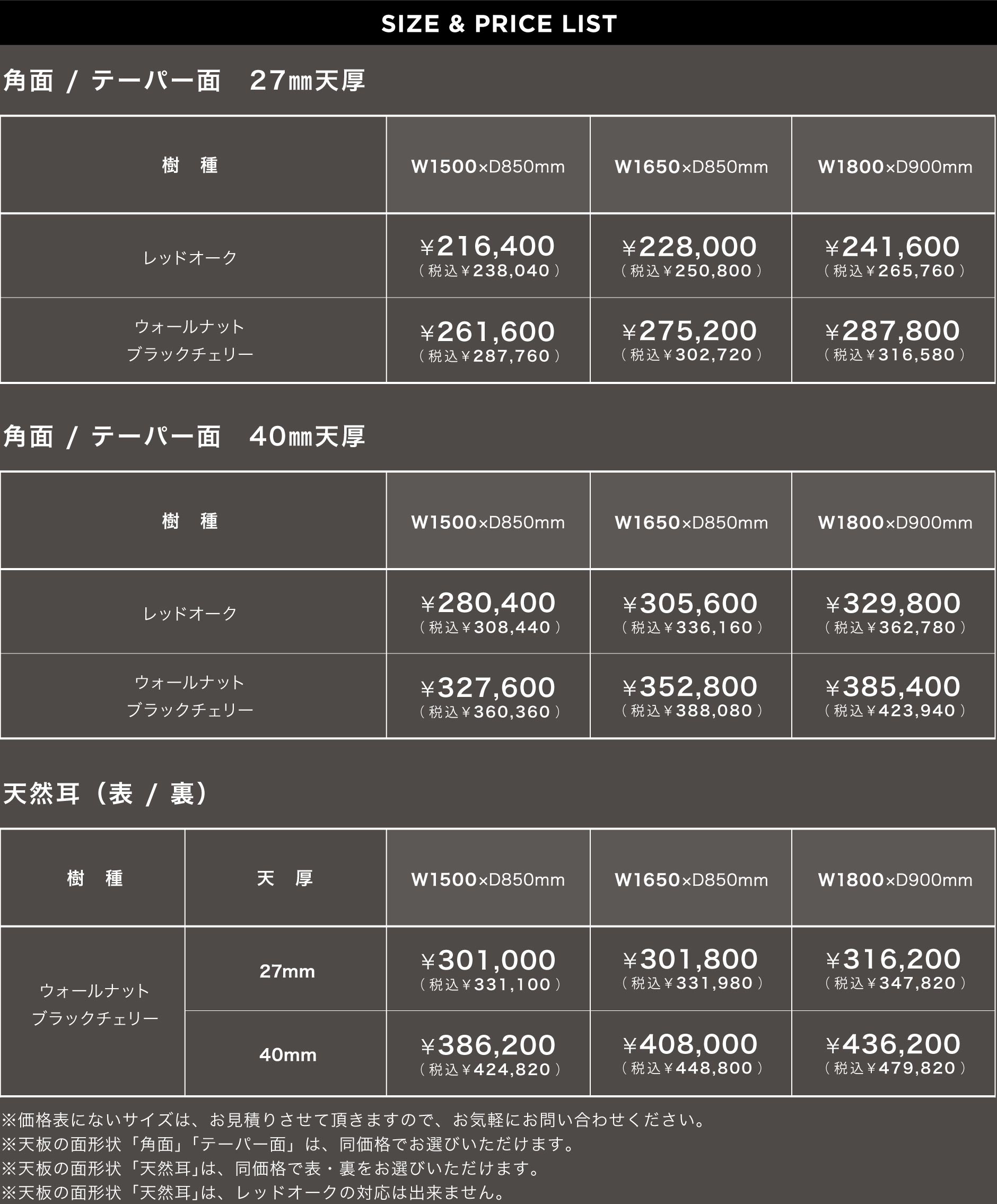 ※節有りはウォールナットとブラックチェリーのみ。