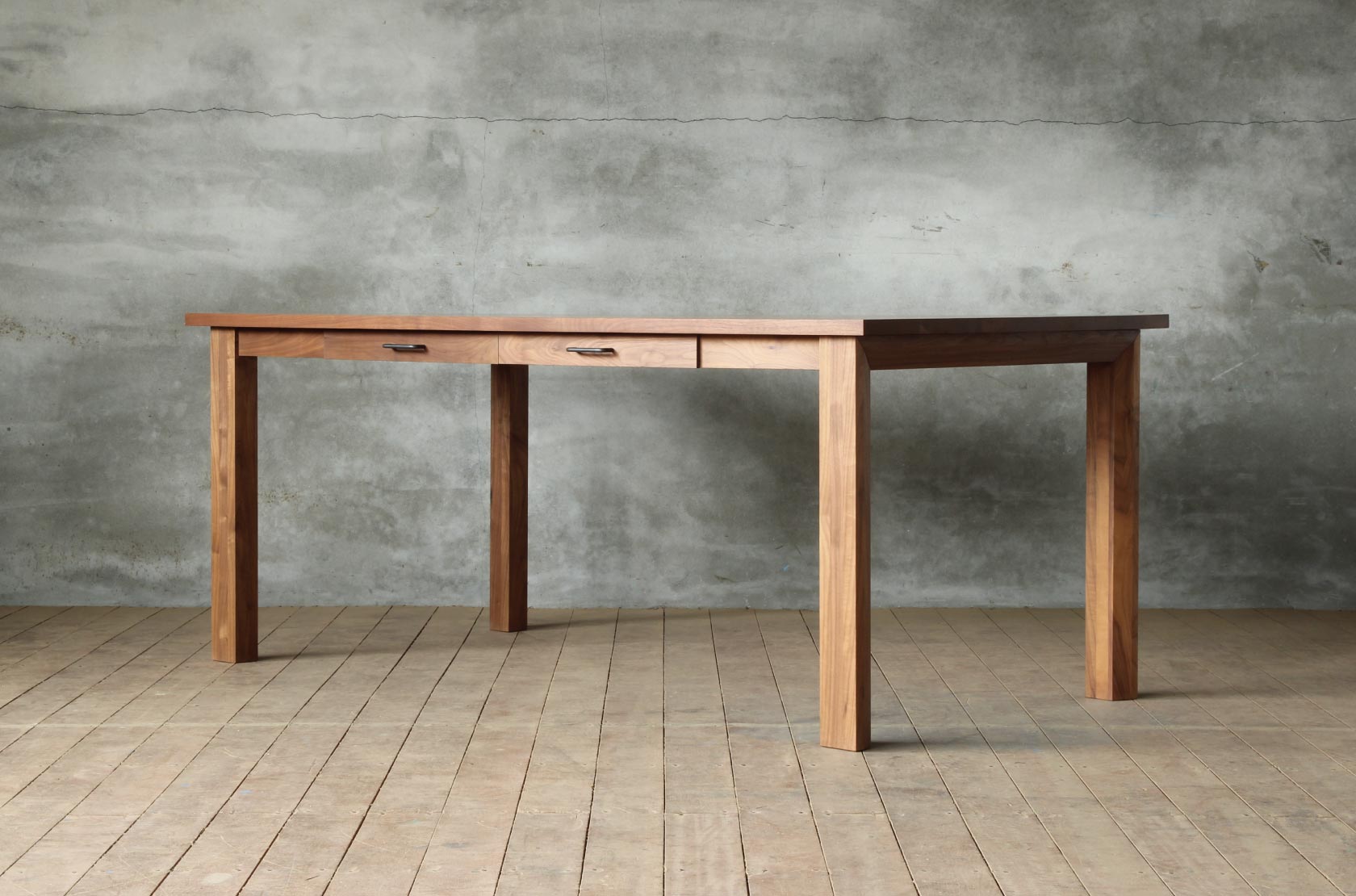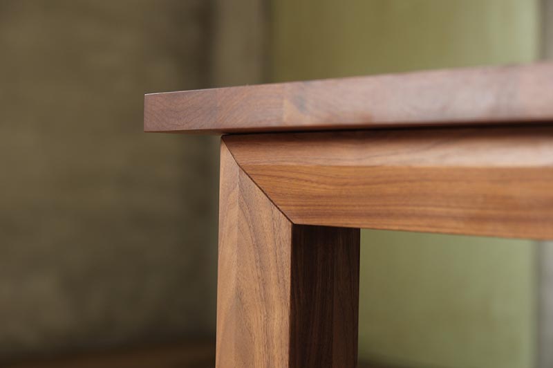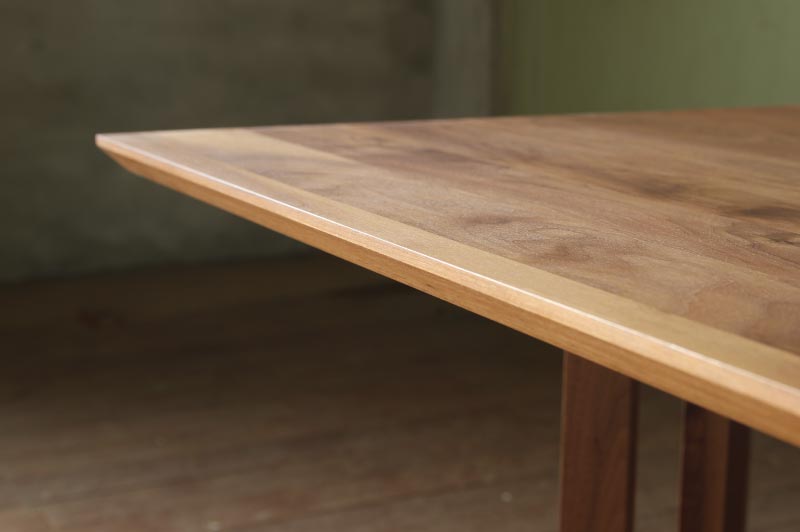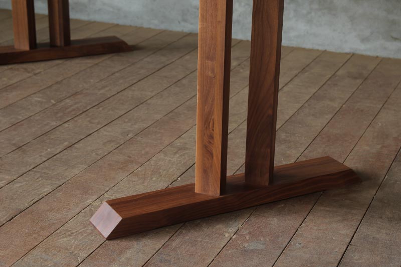 お誕生日席にも人が座れて来客にも対応ができる4本脚のダイニングテーブル。外側から見るとシンプルな角柱のデザインですが、内側には斜めにカットされており違った表情を見せます。