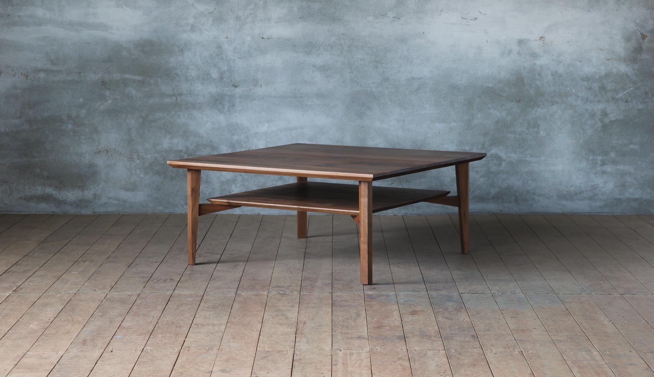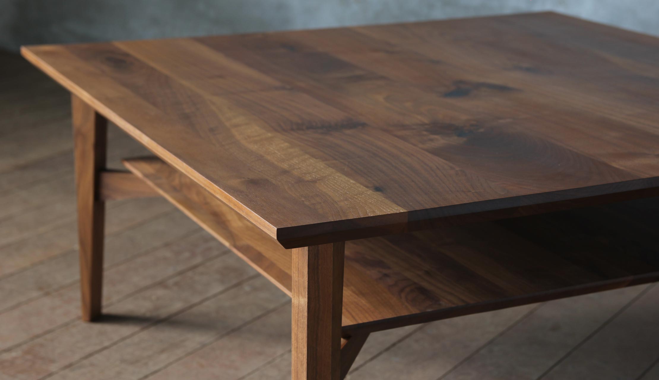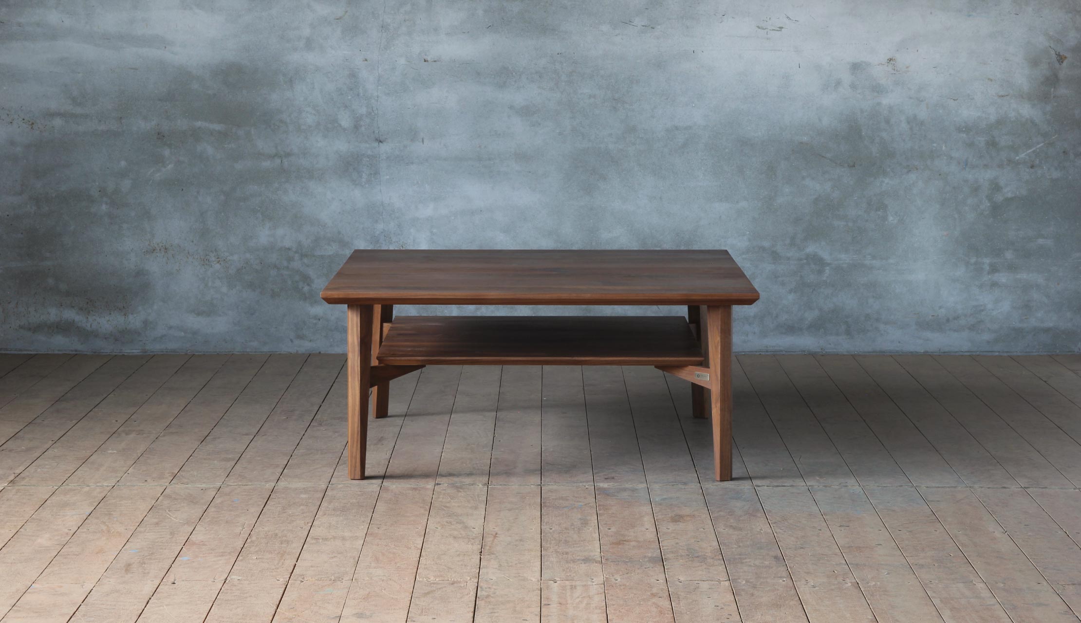 総無垢材の正方形のリビングテーブルはお部屋に存在感を与えてくれます。広々とした正方形の天板は上に物を広げてもゆったりできるサイズ感。棚付きの為リモコン、ティッシュボックス等の生活感のあるものをすっきり隠すことが可能です。