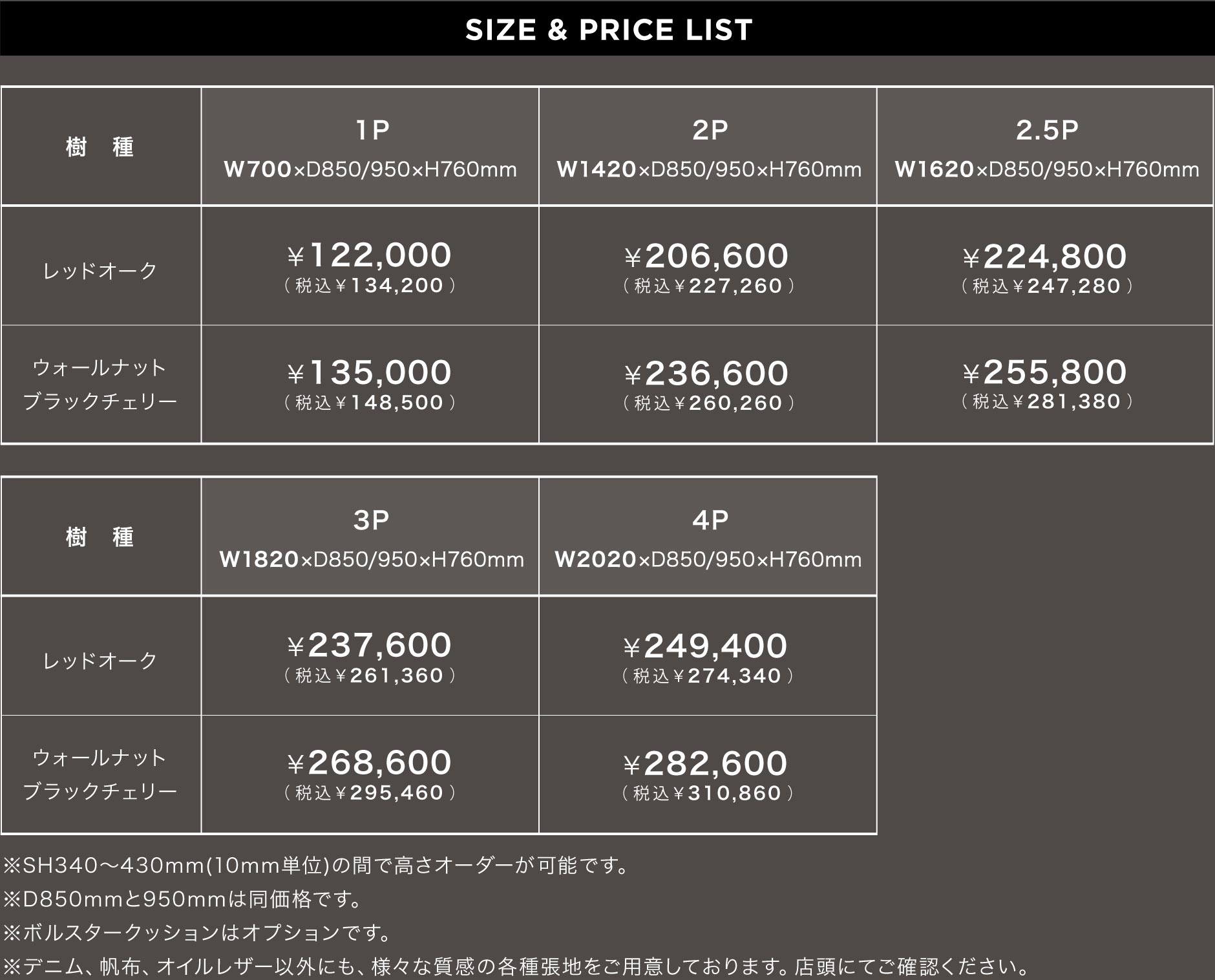 ※写真には価格表外の張地も含まれます。詳しくはお問合せ、もしくは店頭にてご確認ください。