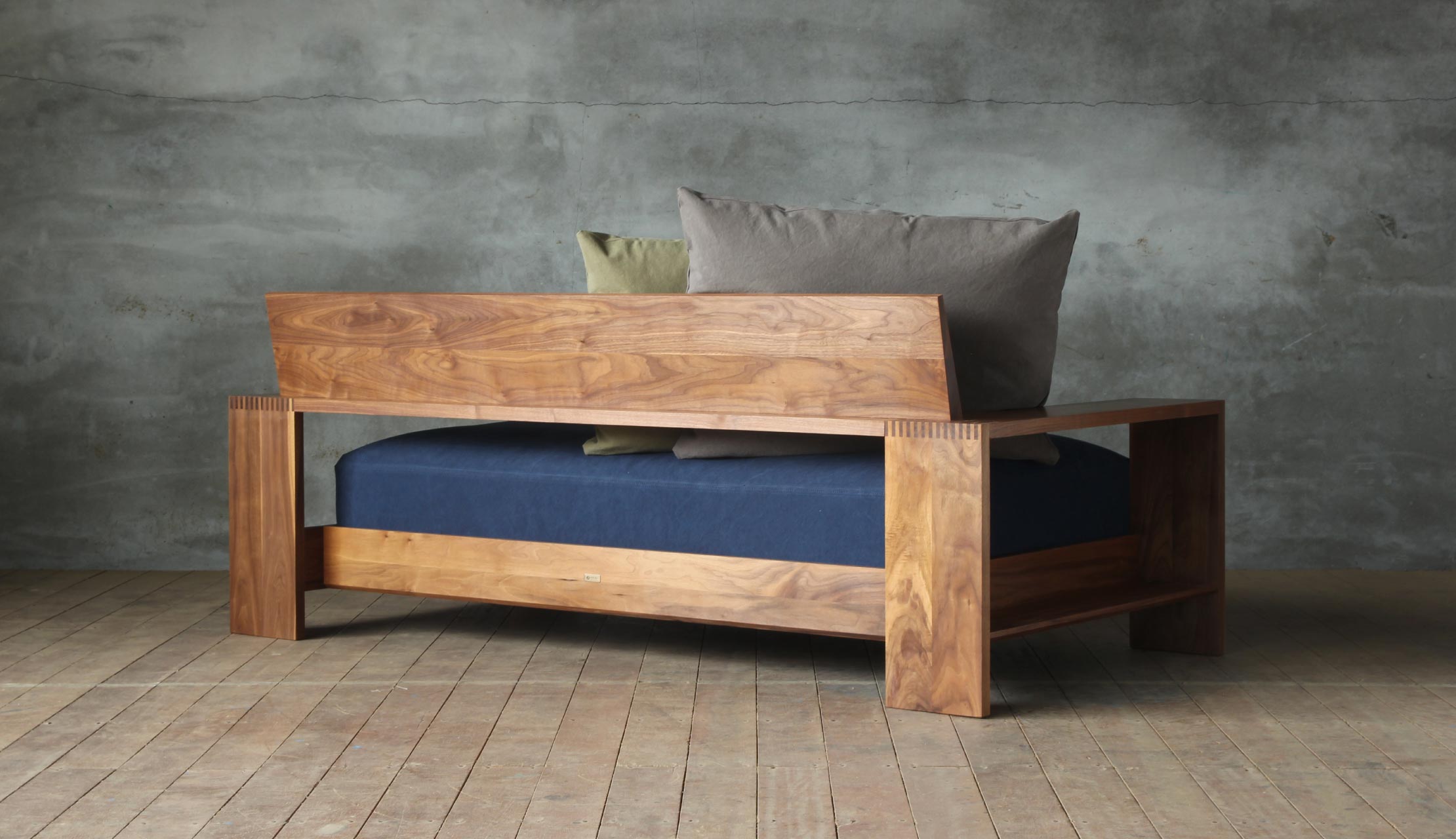 直線的で存在感のあるフレーム、奥行きが広いのでベッドのようにもお使い頂けます。SOLIDらしい堅牢さを十二分に感じていただける無垢材を贅沢に使用。2サイズ展開のオプションクッションを自由に組み合わせることができるため、お好みに合わせてお選びいただけます。