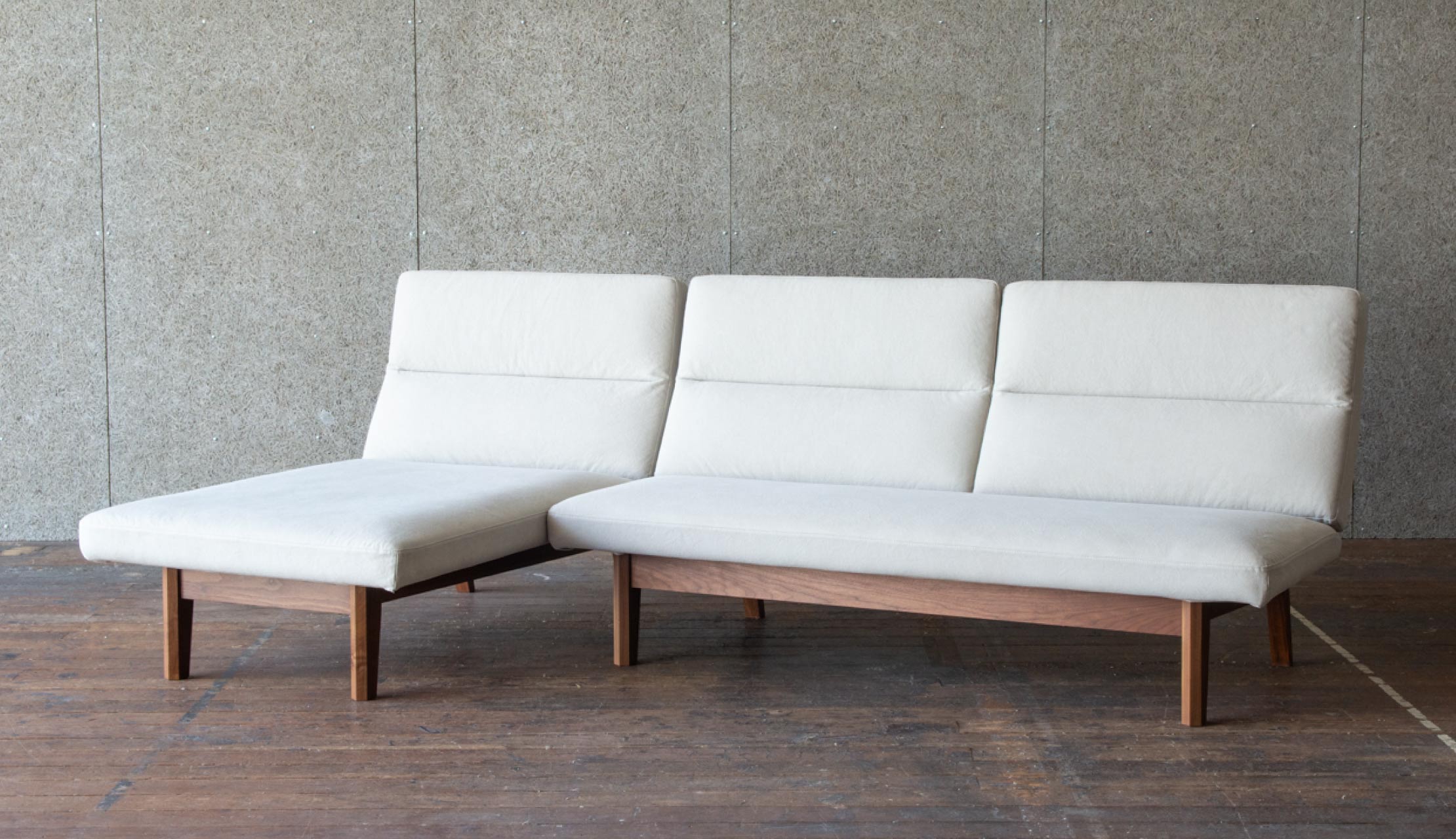 L字型のソファとして組み合わせことが可能なミドルバックソファ。脚を伸ばしてゆったりと寛ぐことが出来ます。少し硬めのクッションでダイニングでもリビングでも大活躍のソファです。