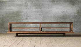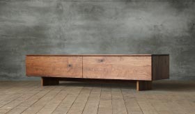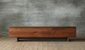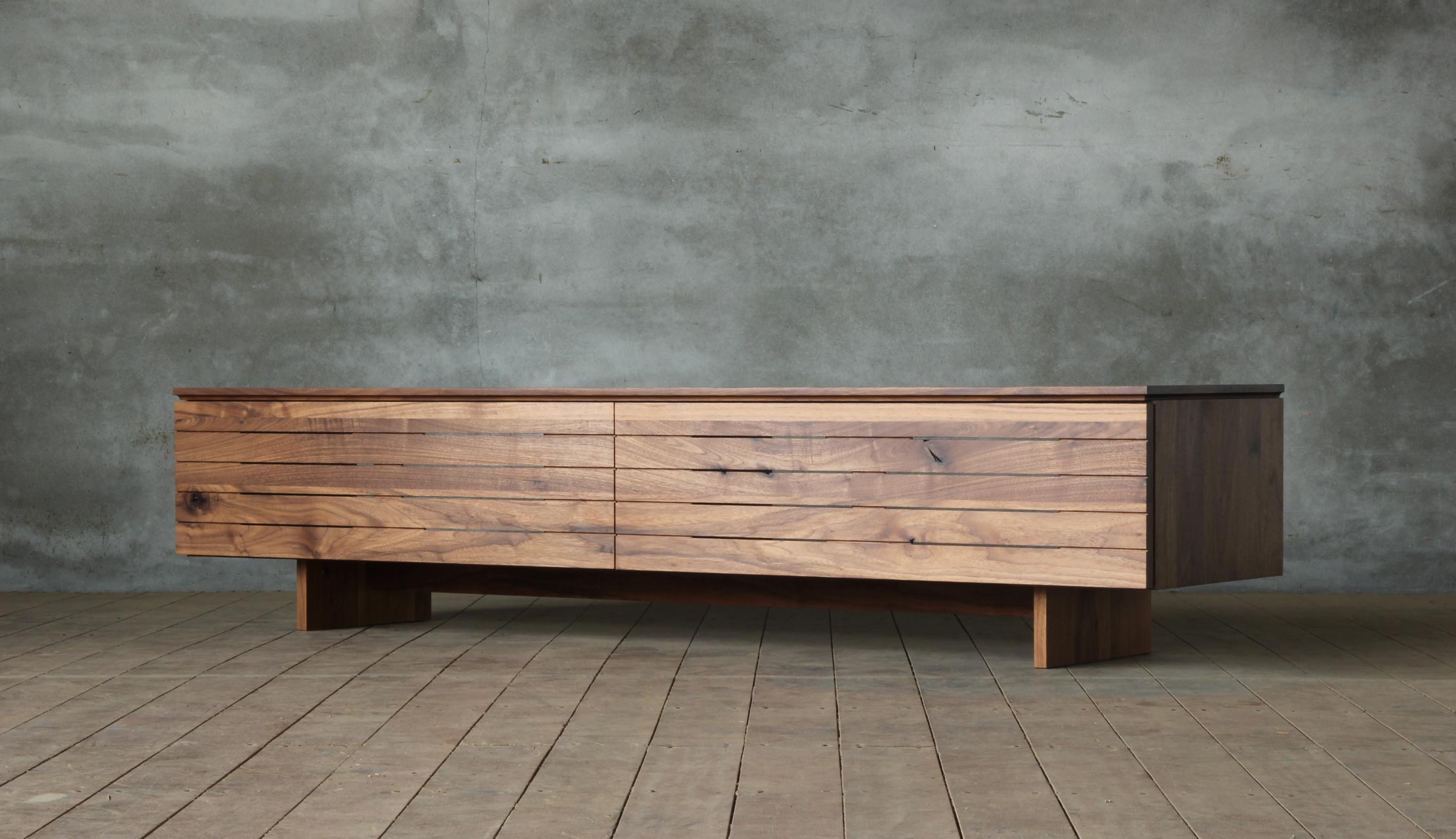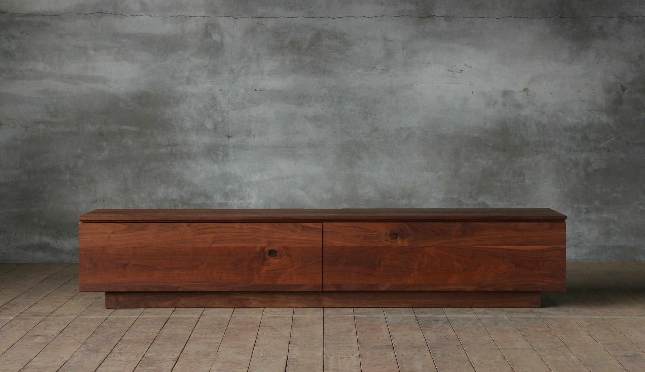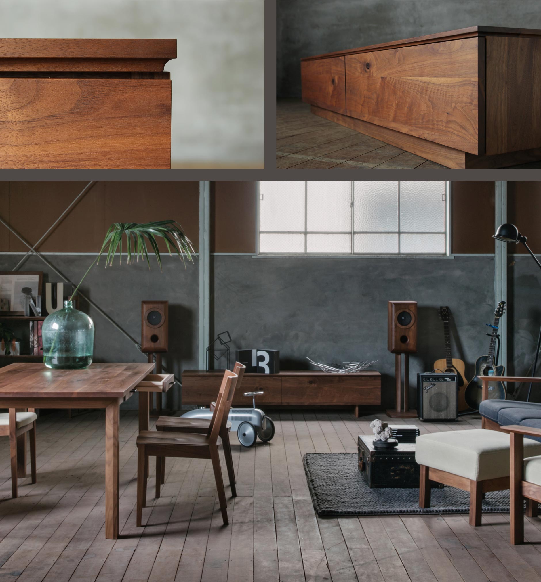 無垢材のみで製作されたTVボード。その見た目は合板では決して味わうことの出来ない高級感を醸し出しています。ディティールの削り出しも、陰影が映えるようにされており、特に色の濃いウォールナットが光り、高級感が出るようにデザインされています。