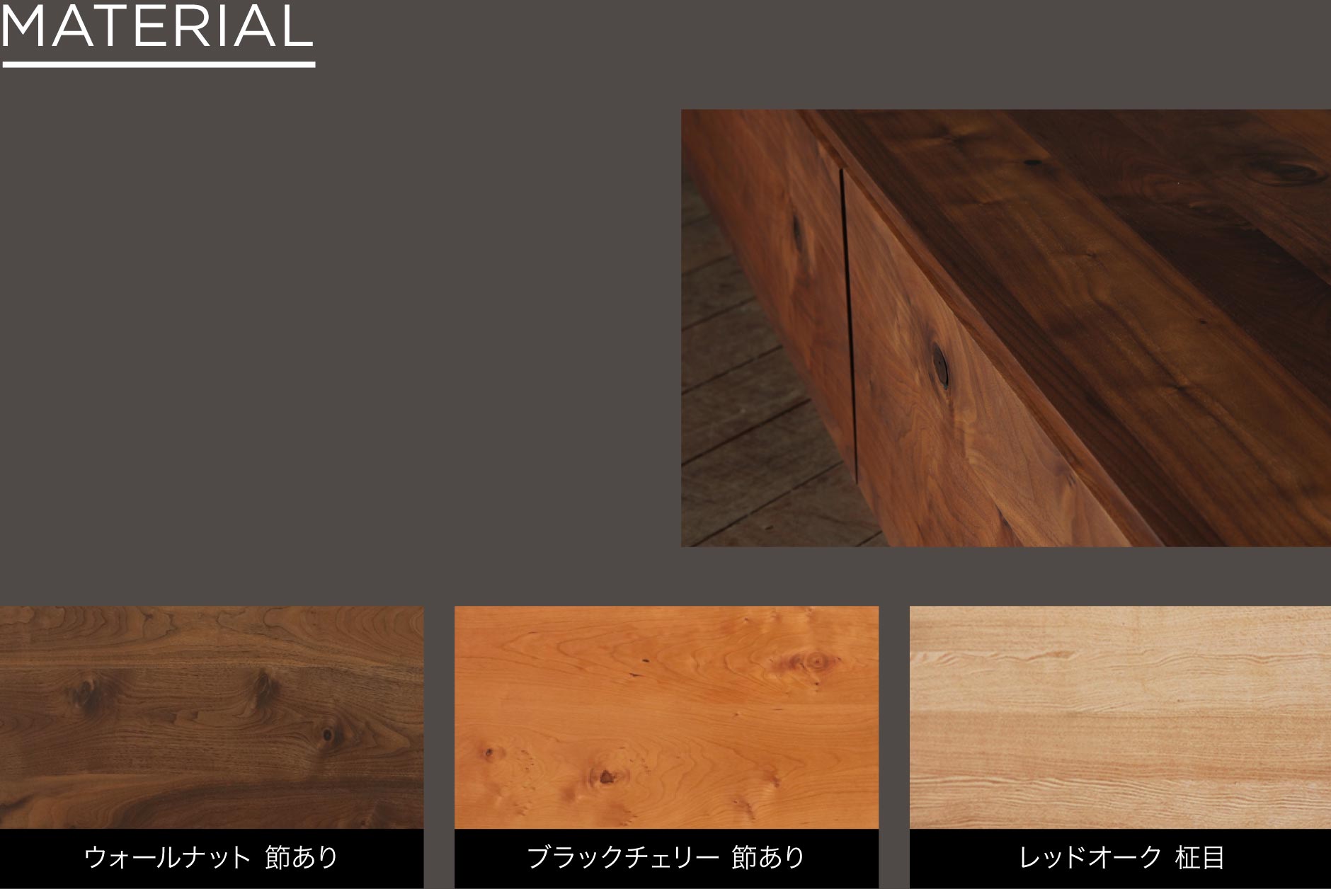 SOLIDでは木材に精通するプロの職人が厳選した無垢材のみを使用しており、ウォールナット、ブラックチェリー、レッドオークの3材種よりお選びいただけます。ウォールナット、ブラックチェリーは素材感を活かす為に節あり、レッドオークは木目の美しさを出すために柾目仕様にしています。お客様のお好み合わせてオーダーが可能です。