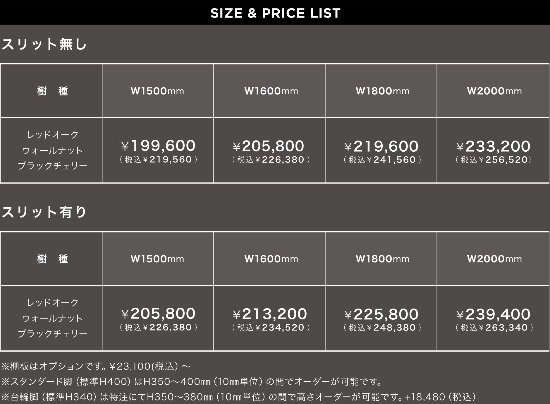 お客様のライフスタイルに合わせて脚のデザインがお選びいただけます。スッキリした見た目のスタンダード脚(SBO01)、お部屋に圧迫感を与えない台輪脚(SBO03)で選びいただけます。高さも変わりますので実際にショップに行って違いを確かめてください。